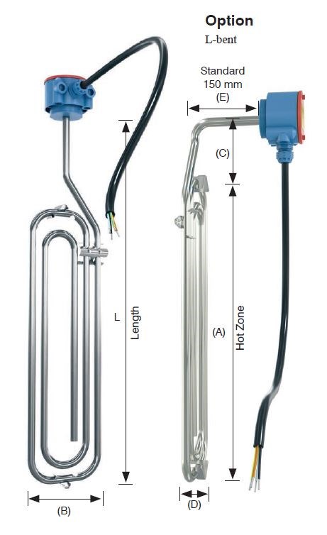 - 2,2 - 4,4 watt/cm2 Mild steel grounded element for max. 70°C process temperature.