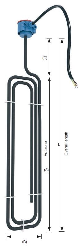 - 1,5 - 2 watt/cm2 PTFE covered stainless steel element 316L grounded element for max. 70°C process temperature.