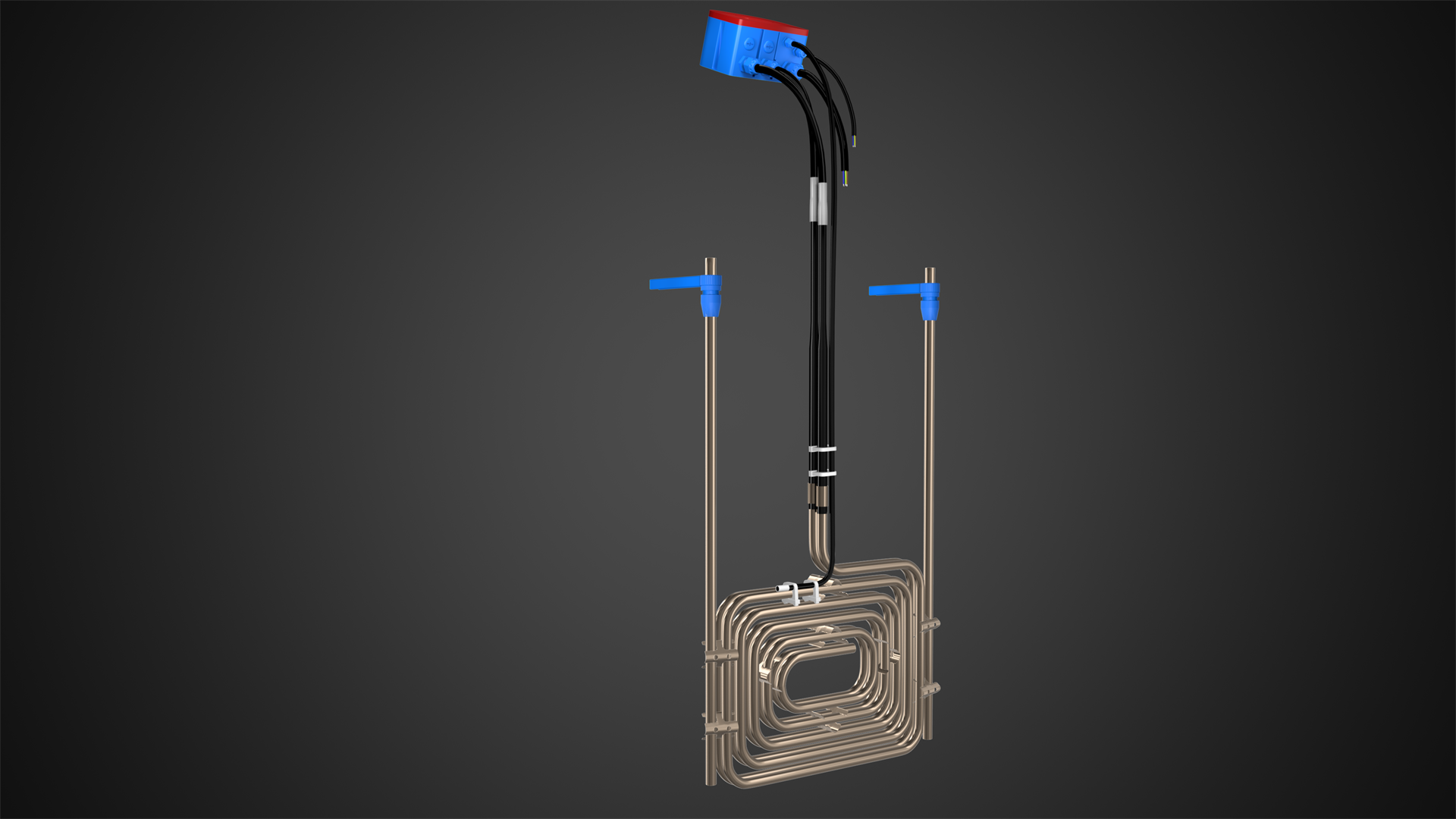 - Compact standard heater design with flexible submersible riser and rigid distance feet in Titanium.